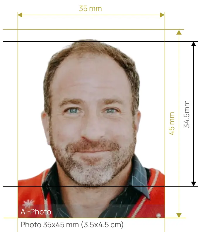 A 35 x 45 mm photo is one of the most frequently used universal-size photos, which and used to apply for many documents of different countries. The 45mm height and 35mm width dimensions are standard ID photo sizes for: