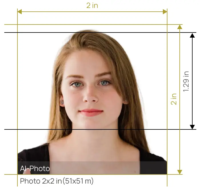 Each universal photo has its unique size and so do 2 x 2 in photos. The size of the 2 x 2 in photo is 2 inches in width and 2 inches in height. The length in millimeters is 51 mm and the width is 51 mm as well. In addition to the size of the photo there are requirements regarding the applicant's image. For example the applicant's head height needs to be 1.29 inches and the dimension from the bottom of the photo to the applicant's eye line should be about 1.18 inches.