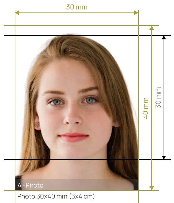 Universal-size photos have various dimensionsundefined like 2 x 2 inchesundefined 35 x 45 mmundefined 50 x 70 mmundefined etc. A 30 x 40 mm photo is one of them with a unique size which is 30 mm in width and 40 mm in height. It is equivalent to a photograph whose width is 1.18 inches and height is 1.57 inches. Besidesundefined there is another rule about the head height of the applicantundefined which is supposed to be about 30 mm. In additionundefined the distance from the top of the photo to the top of the applicant's hair should be 2.5 mm.