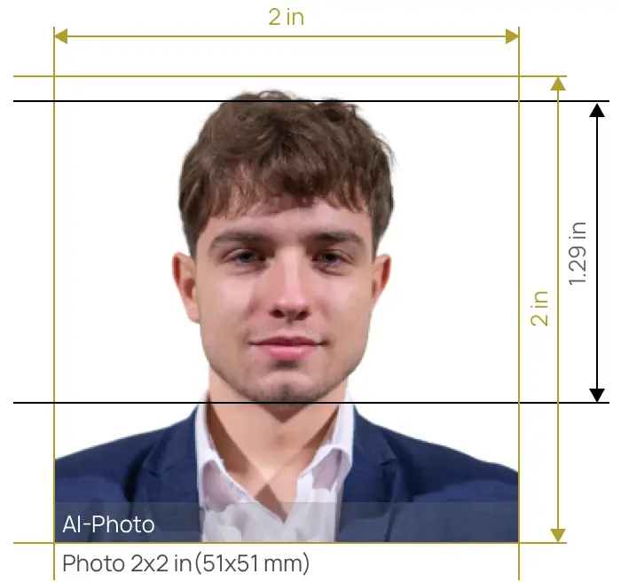 A 2 x 2 inch square image is equal to a 5.1 x 5.1 cm photograph (photo's width is 5.1 cm and height is 5.1 cm). This can also be written as 51 x 51 mm (photo is 51 mm wide and 51 mm high). These are all the same size. If you are not sure about the size, you can use our 2 x 2 in photo cropper to check whether the size is right or not and correct it if it is wrong. All you need to do is to choose the related document and upload your picture. Our AI-based technology will automatically take care of the rest of you.