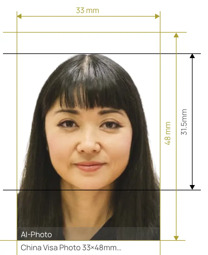 Paper Photo (It means you have an offline application for a China Visa): the printed photo should be 33mm×48mm (width×height)/about 1.3×1.9 inches, head width is 15mm-22mm, height (chin to top of head) is 28mm-33mm, head to upper edge is between 3mm-5mm.