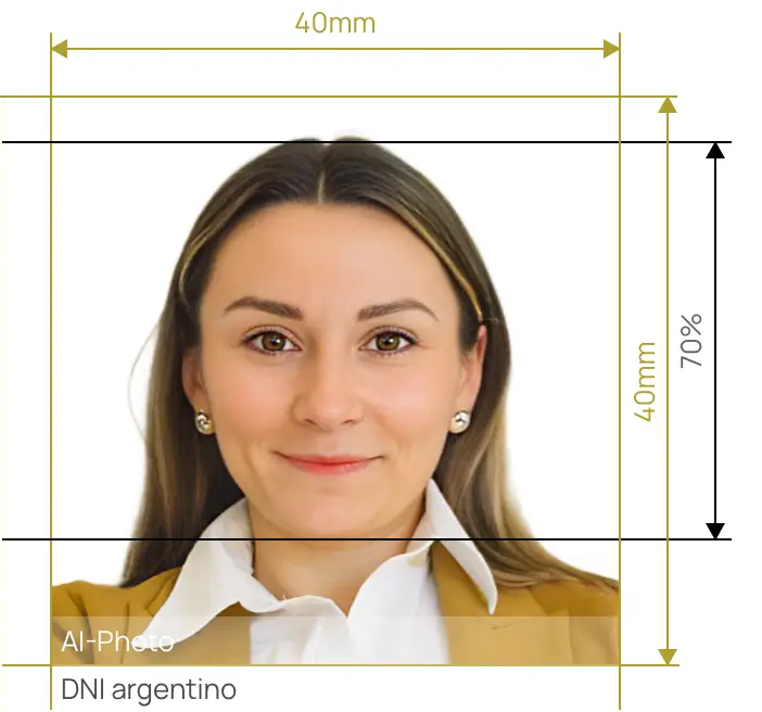 Como se mencionó anteriormente, debe tomarse una foto biométrica antes de solicitar una tarjeta de identificación argentina. Hay algunos requisitos de fotos que debe tener en cuenta, siendo los requisitos de tamaño los que debe priorizar. El tamaño de la foto es de 4 x 4 cm (40 x 40 mm). Además, la altura de la cabeza del solicitante debe representar alrededor del 70 % de la foto..