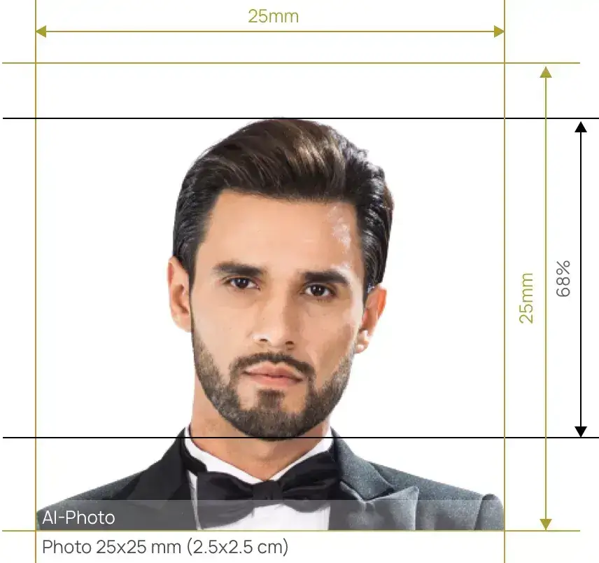 The size of a 25 x 25 photo should be 25 mm (2.5cm) in width and 25 mm (2.5cm) in length, equivalent to 0.98 in x 0.98 in or 591 px x 591 px (in pixels at 600 dpi). What's more, there are requirements for the applicant's head height, which should account for 68% of the picture. Additionally, the size of the bottom of the photo to the applicant's eye line should take up 56% of the picture.