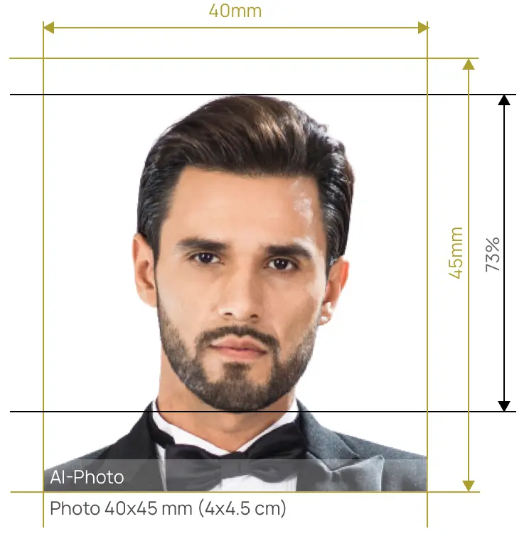 A standard 40 x 45 mm photo must comply with all the size requirements. Therefore, please make sure that your picture is of the correct size. AiPassportPhotos can help you resize your photo according to the type of document you want. Give it a try!